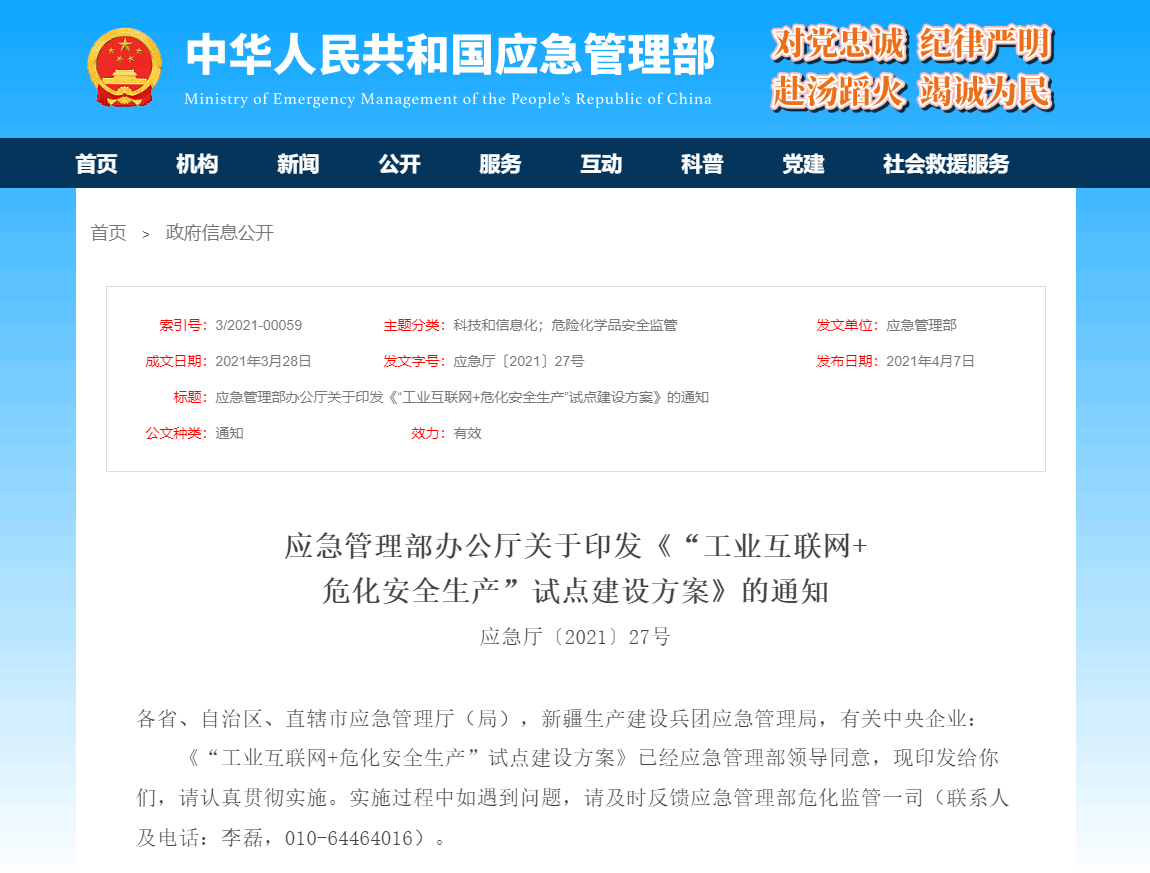 4月7日,國(guó)家應(yīng)急管理部官網(wǎng)正式對(duì)外印發(fā)《“工業(yè)互聯(lián)網(wǎng)+危化安全生產(chǎn)”試點(diǎn)建設(shè)方案》。