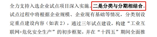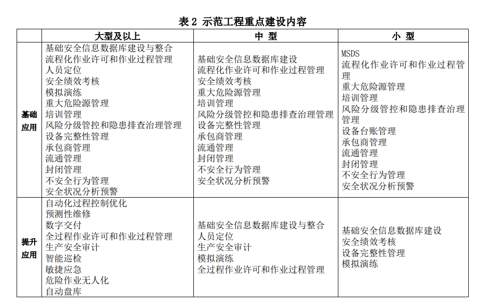本次方案一大亮點(diǎn)就是,從框架和內(nèi)容上看,思路非常清晰,不僅對(duì)不同規(guī)模危化企業(yè)有不同的要求,而且還區(qū)分基礎(chǔ)應(yīng)用和提升應(yīng)用,并沒(méi)有出現(xiàn)過(guò)去簡(jiǎn)單一刀切的做法。這點(diǎn)從方案最后一張“示范建設(shè)重點(diǎn)內(nèi)容表”體現(xiàn)的尤其突出: