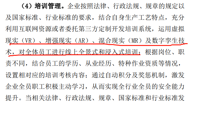 本次方案的另外一大亮點(diǎn)是,在方案中既有大量具體可落地的實(shí)用的內(nèi)容:作業(yè)流程管理、隱患排查治理、風(fēng)險(xiǎn)分級(jí)管控、承包商管理、培訓(xùn)管理…;又有大量的前瞻性的內(nèi)容:工業(yè)互聯(lián)網(wǎng)標(biāo)記與解析、5G、邊緣智能、虛擬現(xiàn)實(shí)(VR)、增強(qiáng)現(xiàn)實(shí)(AR)、混合現(xiàn)實(shí)(MR)及數(shù)字孿生技術(shù)、IoT電子鎖、作業(yè)無(wú)人化等等。這就是人們常說(shuō)的“既腳踏實(shí)地,又抬頭看路”。以方案中一個(gè)模塊“培訓(xùn)管理”為例,方案中就有相當(dāng)多具體管理要求,又涵蓋了可以融合的新技術(shù):