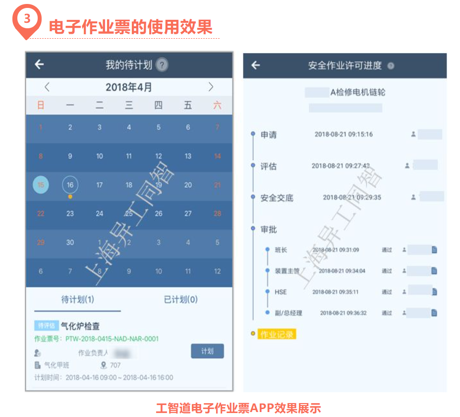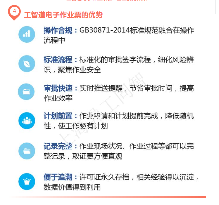 工智道電子作業票管理系統融合《GB30871-2014化學品生產單位特殊作業安全規范》,融入行業先進管理經驗,通過流程優化將現有作業申請單、特殊作業許可證和安全交底單業務內容數字化,轉化為安全作業許可電子化業務流程(電子作業票),實現全業務覆蓋、高標準評價體系、全局管控可視化的數字化作業管理。